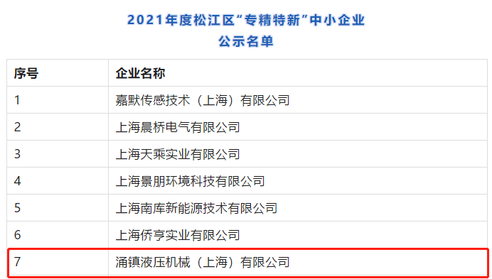 《松江區(qū)“專精特新”中小企業(yè)發(fā)展專項支持實施細則(2020年版)》(滬松經(jīng)〔2020〕165號),區(qū)經(jīng)委組織開展了2021年度松江區(qū)“專精特新”中小企業(yè)申報和復(fù)核工作。涌鎮(zhèn)液壓充分發(fā)揮自身優(yōu)勢,堅持獨立自主的研發(fā)與創(chuàng)新設(shè)計,憑借高效的產(chǎn)品創(chuàng)新能力和廣泛的市場認可度,成功申報并獲得上海市松江區(qū)“專精特新”的稱號。